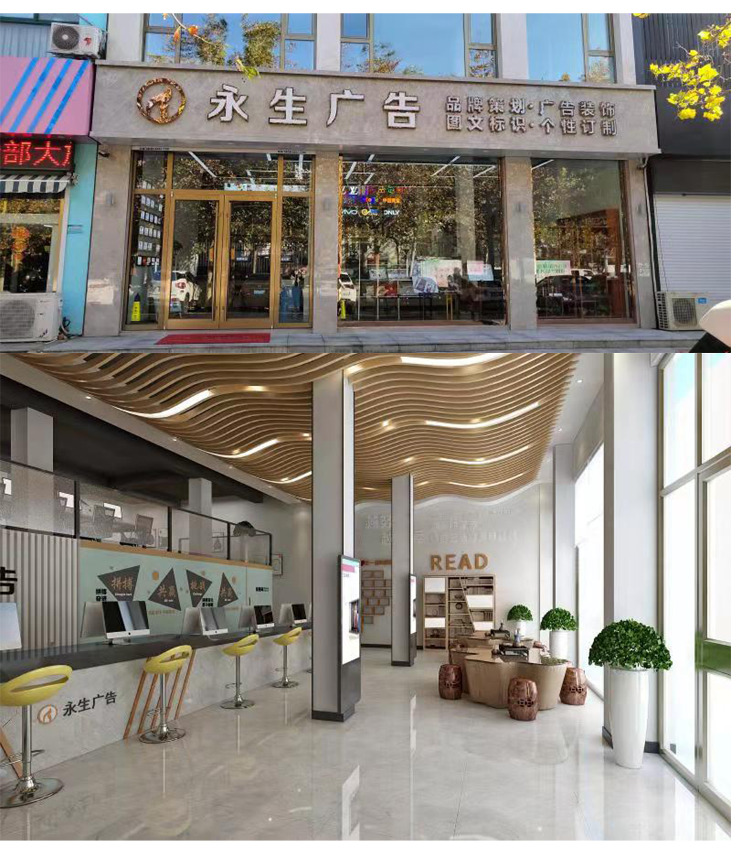 公司自有數(shù)碼沖床設備、500W光纖機、高精度大幅面噴繪機、寫真機、UV機、多種大小型雕刻機、吸塑機、全自動圍字機、自動開槽機、激光焊接機、拋光機等生產加工設備,擁有完善的設計團隊、技術團隊、施工團隊、售后團隊,可為廣大客戶提供室內裝修、店招門頭、精神堡壘、黨建標識、標識標牌、宣傳欄、LED顯示屏、警示標識、精品字、證卡胸牌、證書獎杯、燈箱、桌牌、定制禮品、展具、噴印等多種專業(yè)廣告服務...